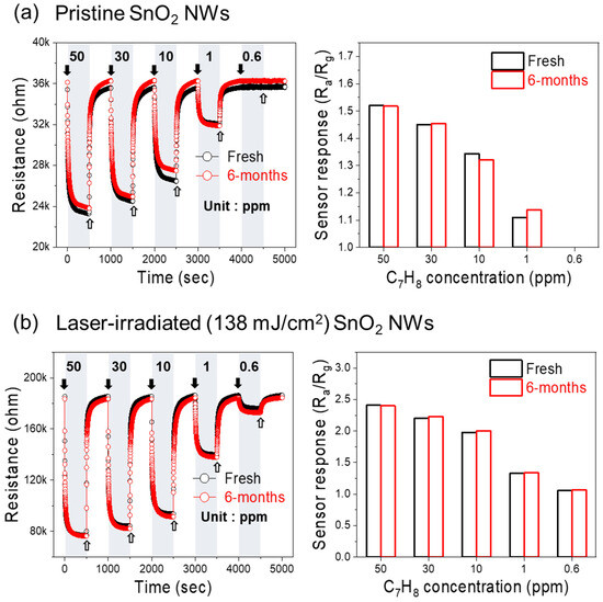 The fresh and 6-month-old SnO2 gas sensor were used to examine the long-term stability of a laser-irradiated SnO2-NW gas sensor. To the best knowledge of the authors, this is the first time the long-term stability of a laser-irradiated SnO2-NW gas sensor has been investigated. Figure 9 shows the dynamic resistance curves and the corresponding sensor response for the pristine SnO2 NWs (Figure 9a) and laser-irradiated SnO2 NWs with a laser energy density of 138 mJ/cm2 (Figure 9b) toward 0.6, 1, 10, 30, and 50 ppm of C7H8 gas. For the pristine and laser-irradiated SnO2 NWs, the fresh and 6-month-old gas sensors showed comparable gas sensor performance. It is worth noting that the laser-irradiated SnO2 NWs were able to sense 0.6 ppm of C7H8 gas with a sensor response of 1.06 and 1.07 for the fresh and 6-month-old sensors. On the contrary, no sensor response was examined at the C7H8 gas concentration of 0.6 ppm for the pristine SnO2 NWs. This result supports the notion that FS laser irradiation enhances gas sensor sensitivity.