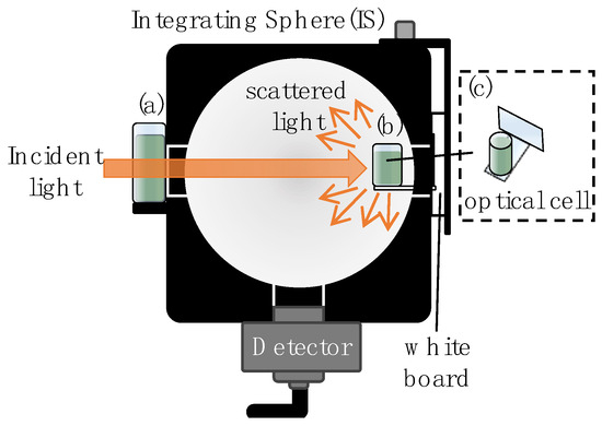 For the measurement of A(λ) of scatterer-added samples, it was essential to collect all scattered light to detect light for various PLs. Consequently, the measurements were conducted in the setup shown in Figure 1b. In this setup, the scatterer-added samples were placed in a cylindrical optical cell made of quartz glass, as shown in Figure 1c, and inserted through the diffuse reflection measurement window of the IS. After the insertion of the cell, the diffuse reflection window was sealed with a white board made of the same material as the IS’s inner wall to ensure the complete collection of scattered light.