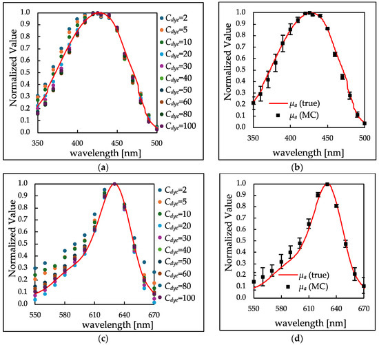 To accurately estimate the actual µa(λ) from the absorbance spectra A(λ), MC simulations were conducted, as outlined in Section 2.3. Figure 6 presents comparisons between µa(λ) calculated from A(λ) of the scatterer-added sample (Cdye = 100) in Figure 4a using MC and the true µa(λ), as calculated by Equation (2). Figure 6a,b show that the shapes of the absorption peaks calculated by MC replicate the shapes of the true peaks.