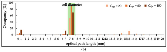 Figure 8 shows the PL distribution at 426 nm (high absorption peak) ranging from 0 to 20 mm, divided into 1 mm intervals. Without scatterers, the distribution predominantly concentrates around the cell’s diameter [Figure 8b], whereas the addition of scatterers results in a significantly broader PL distribution [Figure 8a]. Moreover, in samples with added scatterers, as Cdye and consequently µa increase, it is observed that the PL distribution shifts toward shorter distances. This shift is thought to occur because, in cases of high µa, the transmitted light becomes too weak unless the PLs are sufficiently short. This result indicates that the addition of scatterers ensures the presence of sufficiently short light paths, allowing for the accurate measurement of absorbance spectra without a flattening of peaks, even in high-absorption areas. In contrast, in samples without scatterers, the distribution is observed to be within the 0 to 1 mm range, but this predominantly includes light that has reflected off the surface of the cell, essentially resulting in zero PL. Light with zero PL does not contribute useful information about the sample’s absorption and behaves as stray light.