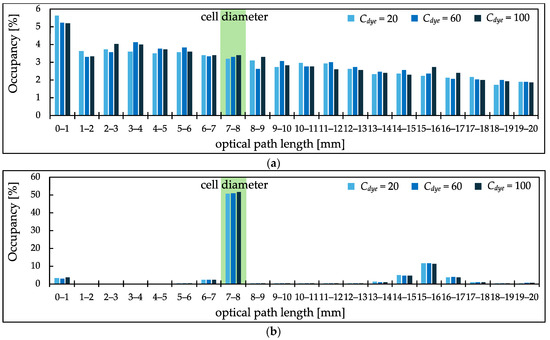PL distributions estimated by MC for absorbance measurements at 426 nm (high absorption peak) in the setup of Figure 1b. The PL distributions are shown for dye solutions (Cdye = 20, 60, 100) with (a) scatterers added and (b) without scatterers, with distribution ratios in the range 0~20 mm at 1 mm intervals; the interval indicated by the light-green band is the interval including the diameter of the optical cell containing the sample.