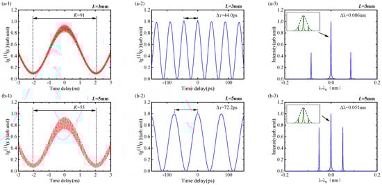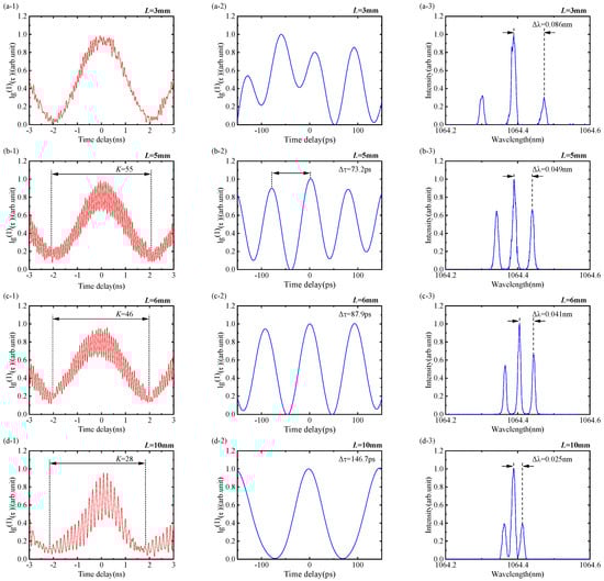 The simulated results in Figure 1 show that the generated burst pulses have different characteristics when the laser cavity is 600 mm and the Nd:YVO4 crystal lengths are 3, 5, 6, and 10 mm. The pulse width (full width at half height) of the burst pulses is determined by the laser cavity optical length and calculated by , where c represents the speed of light, resulting in a pulse width of 2 ns. The number of subpulses within a burst pulse equals the ratio of the laser cavity optical length to the Nd:YVO4 crystal. As shown in Figure 1(a-1,b-1,c-1,d-1), the number of subpulses is 91, 55, 46, and 28, respectively, corresponding to the crystal lengths of 3, 5, 6, and 10 mm. Figure 1 shows the subpulse waveforms (a-2), (b-2), (c-2), and (d-2). The subpulse repetition intervals are 44.0, 72.2, 88.0, and 144.3 ps, and the calculated repetition frequencies of the subpulses are 22.73, 13.64, 11.36, and 6.82 GHz, respectively. Figure 1(a-3,b-3,c-3,d-3) show the longitudinal mode distribution of the burst pulses. The longitudinal mode intervals are determined by the Nd:YVO4 crystal-formed F-P cavity FSR as 0.086, 0.051, 0.043, and 0.023 nm, which is consistent with the subpulses repetition frequency of Figure 1(a-2,b-2,c-2,d-2). The laser cavity fundamental longitudinal mode (sub-longitudinal mode) spectra are plotted in the inset of Figure 1(a-3,b-3,c-3,d-3), and the laser cavity FSR determines the sub-longitudinal mode spacing.