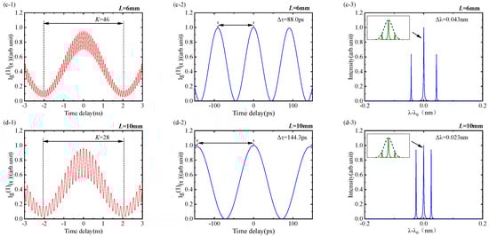 As shown in Figure 4(b-1,c-1,d-1), when the Nd:YVO4 crystal lengths are 5, 6, and 10 mm, respectively, the laser’s burst pulses and subpulses are clearly distinguishable, and the number of subpulses is 55, 46, and 28, as shown in Figure 4(b-2,c-2,d-2), respectively. The time intervals of the subpulses are approximately 73.2, 87.9, and 146.6 ps, and the corresponding repetition frequencies are 13.66, 11.37, and 6.82 GHz, respectively, which are in good agreement with the simulated results.