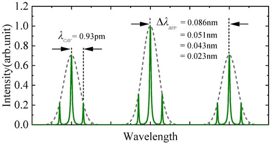 Figure 2 shows the detailed diagram of the theoretical simulation laser spectra. The sub-longitudinal mode spacing is 0.93 pm, which corresponds to the FSR of 600 mm length laser cavity. The longitudinal mode spacing is 0.086 nm, 0.051 nm, 0.043 nm, and 0.023 nm, corresponding to the crystal lengths of 3 mm, 5 mm, 6 mm, and 10 mm.