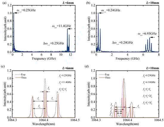 Figure 5a,b show the time–frequency spectra of the burst pulses for laser crystal lengths of 6 and 10 mm. The sub-longitudinal mode distribution estimated by the time spectrum of the burst pulse is shown as the solid line in Figure 5c,d, while the dashed line represents the spectral envelope measured in the experiment, which corresponds to Figure 4(c-3,d-3).The frequency component of 0.25 GHz is observed in the low-frequency range when the Nd:YVO4 crystal is 6 mm as shown in Figure 5a. The two frequency components of 11.40 and 11.65 GHz are observed in the high-frequency range. According to Figure 4(c-3), because the FSR of a 6 mm laser crystal is 11.35 GHz, the output laser spectra are optical spectral envelopes with an interval of 11.40 GHz, and each envelope contains 1 to 2 fundamental sub-longitudinal modes. From the option of 1:2:1 or 2:1:2 types, considering the Gaussian distribution of the laser spectra, the specific distribution form of sub-longitudinal mode spectrum is shown in Figure 5c as 1:2:1 type. In addition, when the Nd:YVO4 crystal is 10 mm, as shown in Figure 5b, the frequency component of 0.25 GHz and the harmonic frequency component of 0.5 GHz are observed in the low-frequency range. In the high frequency range, four frequency components of 6.31, 6.56, 6.81, and 7.06 GHz are observed, with a frequency difference of 0.25 GHz. Considering the FSR of a 10 mm laser crystal is 6.81 GHz, the output laser spectra are optical spectral envelopes with an interval of 6.81 GHz, and each envelope contains two to three sub-longitudinal modes, as shown in Figure 4(d-3). Considering the Gaussian distribution of the laser spectrum, the specific distribution form of sub-longitudinal mode spectra is shown in Figure 5d as 2:3:2 type.