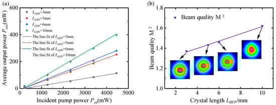 With Nd:YVO4 crystal, = 3, 5, 6, and 10 mm for the output powers and beam qualities of the burst pulses. (a) The relationship of average output power and pumping power ; (b) the beam qualities.