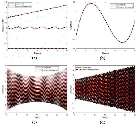 Figure 2 shows reconstructed results of instantaneous frequencies and signal components. It can be seen that the reconstructed submodes after decomposition are essentially consistent with the original subsignals , , set for the simulated signal, as shown in Figure 2b–d. It verifies the effectiveness and accuracy of the proposed algorithm.