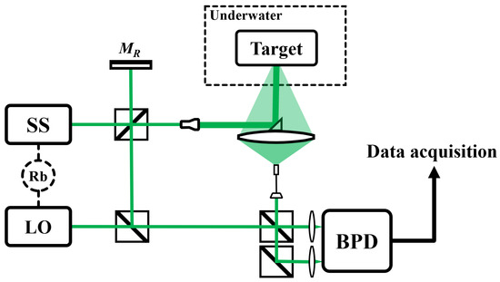To further demonstrate the effectiveness of our method on real signals, the subsequent section details the application of this method to a practical dual-comb LiDAR signal from underwater. Figure 3 shows the schematic of the underwater dual-comb LiDAR system [19]. The signal source (SS) and the local oscillator (LO), both having a central wavelength of 515 nm, with the SS boasting an output power of 300 mW and the LO of 20 mW, share a repetition frequency of approximately 36.5 MHz, which is adjustable within a certain range. The difference in repetition frequency is maintained at 2 kHz, indicative of the data refresh rate for the range finding. A rubidium clock (Rb, Microsemi 8040, Aliso Viejo, CA, USA) ensures systemwide time synchronization, thus stabilizing the entire setup. Notably, the SS signal is bifurcated into reference and measurement beams, reflected, respectively, by the reference mirror () and the underwater target. A large lens captures backscattered signals containing distance information, which are then combined and made to interfere with both the reference and LO signals. Importantly, to maintain precision in the laser’s path, all spatial beams are aligned at an identical height and with strict adherence to alignment protocols. To reduce common-mode noise, a balanced photodetector (BPD, Thorlabs PDB230A, Newton, NJ, USA) is employed for capturing the interference signals. Consequently, by analyzing the reference and measurement interferograms, we are able to determine distances based on the time-of-flight (ToF) principle [20,21].