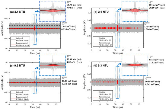 In the experiment, the measurement target (a retroreflector) is securely positioned approximately 1 m within a water container, dimensions being . This container is filled to a depth of 0.2 m with tap water, maintaining a turbidity level below 0.5 NTU (nephelometric turbidity units), as verified by a turbidity meter (REMOND, RMD-Z6, Shanghai, China). Furthermore, environmental conditions, including a temperature of 21.5 °C and water density of 977.887 kg/m3, are meticulously monitored and regulated during signal acquisition. The group refractive index of water can be calculated, based on the Harvey formula [22], as 1.3587851. To simulate the challenges of turbid water, controlled quantities of pure milk are mixed into the water, using a calibrated measuring cylinder for precise volume addition [23]. Subsequent stirring ensures uniform milk distribution, thereby maintaining consistent water concentration. The turbidity meter is utilized to quantitatively assess water quality, indicating turbidity levels of 2.1 NTU and 9.3 NTU for milk additions of 5 mL and 25 mL, respectively. Through this process, genuine experimental signals are captured by an oscilloscope (LeCroy, WaveRunner 9404, Chestnut Ridge, NY, USA) at a 500 MHz sampling rate, facilitating the analysis of the proposed method’s effectiveness under varying turbidity conditions. Figure 4 showcases both the original and the reconstructed signals obtained by the proposed method.