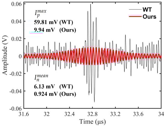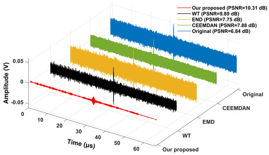 To demonstrate the superiority of our method, we compare the reconstructed result with several classic time-frequency decomposition algorithms, including wavelets transform (WT), EMD, and complete ensemble empirical mode decomposition (CEEMDAN) [24]. Figure 5 illustrates the compared result of different methods applied for the measurement interferogram, and the related PSNR values are also presented in the upper right corner of the figure. From Figure 5, we can find that the PSNR value of our proposed method (i.e., 10.31 dB) performs better than that of WT, EMD, and CEEMDAN. In particular, the shape of our reconstructed signal, especially the measurement interferogram, is close to the Gaussian shape. As shown in Figure 6, we calculate the and of signals processed by WT and our method. Even though the PSNR value of WT is close to our method, the shape of WT’s result is distorted. In comparison, the other three methods demonstrate a degree of effectiveness in denoising but are inadequate in extracting Gaussian-modulated signals. Therefore, the proposed method has great potential in denoising and extracting dual-comb LiDAR signals of complex and turbid water.