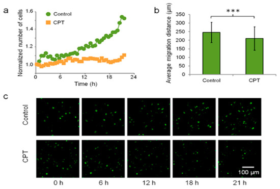 Effect of camptothecin (CPT) on HeLa cells monitored by Talbot fluorescence-imaging system. (a) Cell count over time for the control group and the CPT-treated group. The CPT group showed significantly lower proliferation compared to the control group, demonstrating the inhibitory effect of CPT on cell division. (b) Average cell migration distances for the control group and the CPT-treated group over 21.5 h. Cells in the control group exhibited greater migration distances than those in the CPT-treated group, highlighting the impact of CPT on cell motility (*** p < 0.001). (c) Representative time-lapse images of HeLa cells at 0, 6, 12, 18, and 21 h for both the control and CPT-treated groups. The images reveal the differences in the cell densities and morphologies between the two groups, with the CPT-treated group showing reduced cell proliferation and altered migration patterns. The Talbot Fluorescence ePetri system enables the continuous, high-resolution monitoring of cellular responses to drug treatment within an incubator environment. Reproduced with permission from Ref. [22]. Copyright 2013, American Chemical Society.