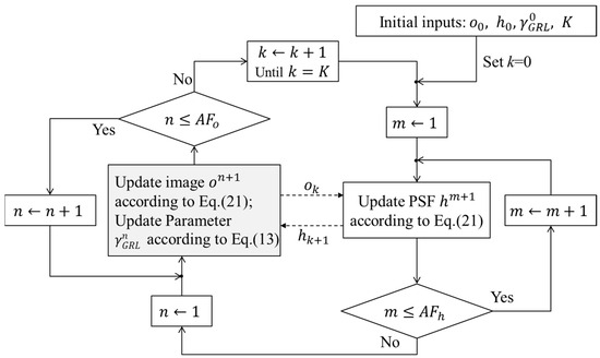 The above denote the asymmetric factors [29] of estimated image and PSF, respectively. is an empirical guess of the energy ratio between actual PSF and sharp target image. The idea of asymmetric iteration from Biggs [29] is also adopted in our method, since the number of inner iteration for PSF is a little bigger than that for the estimated image at the beginning of iteration. The flow chart of our proposed GRL deconvolution algorithm is illustrated by Figure 1.