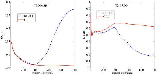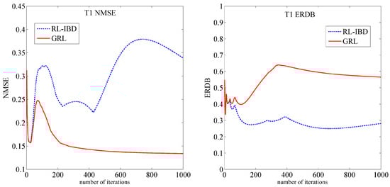 Figure 3, Figure 4, Figure 5, Figure 6, Figure 7 and Figure 8 compare the recovery results of the simulation targets T1, T2 and T3, as well as the NMSE and ERDB results versus the number of iterations. The turbulence intensities used to simulate the blur in T1, T2 and T3 images are , respectively. The initial value of the regularization parameter is set to 0.05 for the GRL algorithm and the results are shown up to 1000 iterations. The time taken in minutes for the recovery of the three images is as follows: T1 [1.9535, 2.2097], T2 [2.4604, 2.6439], and T3 [1.1041, 1.3158], where the first entry in parentheses is the time consumption of the RL- IBD algorithm, and the second entry is that of the GRL algorithm. The computing environments used Windows 7+MATLAB 7.12, Intel i7 2.8 GHz CPU and 16 GB RAM.