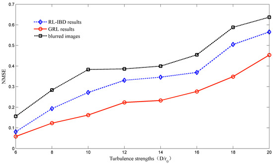 Further, the performance of the post-processing methods under different atmospheric turbulence intensities should also be considered. Figure 9 shows the recovery results obtained using the GRL and RL-IBD algorithms with different turbulence strengths. Note that the RL-IBD algorithm selects the outputs before the noise is amplified. An obvious improvement of the image sharpness can be seen from the NMSE values by our GRL algorithm under different turbulence conditions. This improvement occurs due to the addition of the Gaussian TV constraints. It can be noted from the figure that the GRL algorithm performs better accuracy for recovering degraded images with weak and moderate turbulence intensity from to .