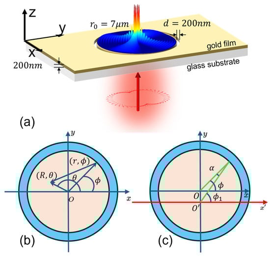 The schematic illustration for generating plasmonic focusing patterns is shown in Figure 1a. A metallic nanoring with an inner radius is etched into a gold film ( at 633 nm) of 200 nm thickness deposited on a glass substrate (n = 1.515). An incident CVB with a wavelength of nm illuminates the metallic nanostructure perpendicularly from the glass side. To investigate the transmission properties under the subwavelength regime () [44,45,46], the slit width is set to be significantly smaller than the incident wavelength (). The subwavelength dimensions of the annular ring structure facilitate momentum matching between the incident light and the surface plasmon polariton (SPP), enabling the excitation and confinement of surface waves. The annular ring operates as a nanoantenna, coupling the incident-free space beam to SPPs propagating along the surface.