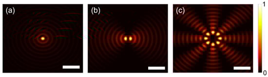 Simulation results of normalized intensity distributions of plasmonic field with interactions between CVB and annular ring. (a–c): Orders of CVB for 1, 2, and 5 as the center are aligned with the center of the annular ring. The scale bar represents a distance of . The plasmonic fields range from −2.5 to 2.5 for both x and y directions in (a–c).