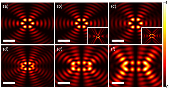 The focusing patterns for different deviation distances with are shown in Figure 3. At ideal alignment (), the focusing pattern exhibits a symmetrical distribution with six lobes (Figure 3a). When the deviation is not comparable to the radius of the annular ring, the focusing patterns remain largely unchanged (Figure 3b,c), where the theoretical prediction in Equation (9) agrees well with the simulations (insets in Figure 3b,c). As increases, the symmetry is progressively broken, leading to more complex electric field distributions (Figure 3d–f), which stem from the mismatched excitation of plasmonic modes due to the offset. The modulation of the focusing patterns in Figure 3d–f is negligible near the y axis, while it is amplified near the x axis. This discrepancy can be explained by the fact that the deviation angle is smaller for observation points closer to the vertical center boundary of the ring compared to those near the horizontal boundary. Consequently, the approximation in Equation (9) is more accurate in regions where is inherently smaller. Nevertheless, in most cases, the approximation formula serves as a valuable tool for analyzing related problems.