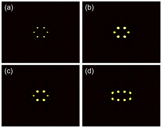 Analyzing the evolution trend depicted in Figure 3, we propose the following judgment criteria to determine the critical deviation value: We measure the intensity distribution and use a certain scale to filter the focus patterns to detect the number of focal points. We observed that, as the “indicator” is distorted, additional focal points appear simultaneously, leading to an increase in the number of focal points. The critical deviation value occurs when the number of focal points begins to change.