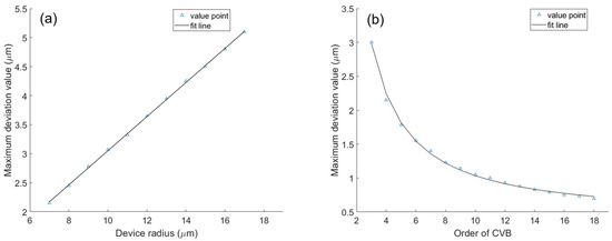 The maximum deviation value as a function of (a) device radius and (b) order of CVB. The colored lines in the figures give the corresponding approximation-fit lines. The order of CVB is fixed as 4 in (a) and the radius of ring is fixed as in (b).