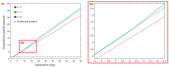Figure 13a that when the integral stage is relatively small, the mutual intensity of all MWMMFI systems is smaller than that of the traditional system. However, after about two or three integrations, the mutual intensity already exceeds that of the traditional system scheme. Additionally, based on the premise that the effective photocurrent signal is not drowned by noise, the larger the merging number is, the larger mutual intensity is. However, under the same integral stage, the increase in mutual intensity caused by changing the merging number from two to three is larger than that caused by changing the merging number from three to four. There is a ceiling effect. The reason for the existence of this ceiling effect is also limited by the aperture of the focusing lens. Referring to the conclusion of
