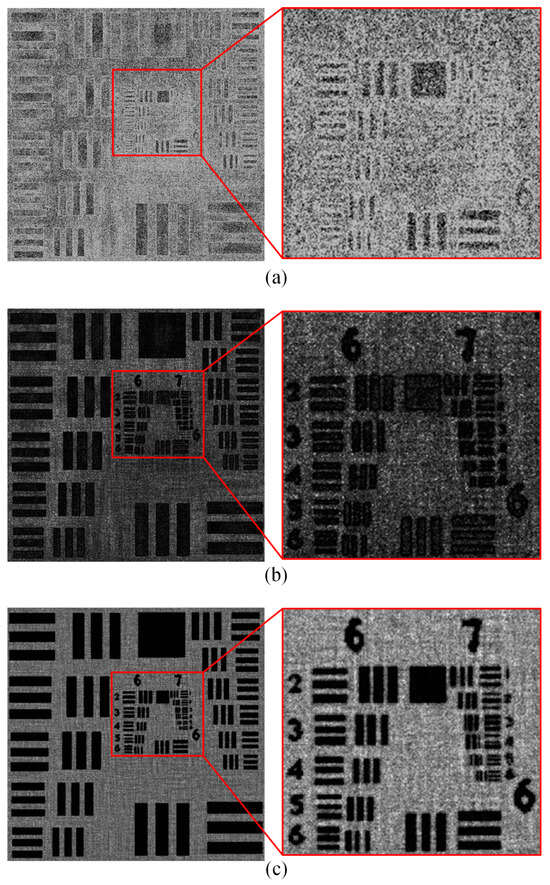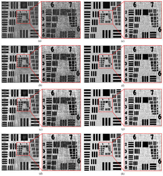 The test results are evaluated by combining subjective visual effects and objective indicators. The subjective visual effect is the method of observing the reconstructed image by the naked eye. It mainly investigates whether the stripes on the resolution board can be clearly distinguished. The peak signal-to-noise ratio (PSNR) was used as the objective index. This is a common evaluation metric in the field of image processing. The larger the PSNR, the better the image quality.