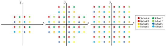 In order to increase the distance between the coded signals, the traditional TCM scheme divides the 2D-mQAM base constellations into four subsets A–D [], where each subset contains m/4 constellation points. However, if the higher-order constellations are represented by increasing the number of points in the 2D-mQAM base constellations, it will increase the number of points in each subset, thus raising the probability of misclassification in the constellation point judgment. In this paper, an SO-8DTCM-QAM scheme is proposed to divide the 2D-mQAM base constellation into eight subsets A-H to reduce the number of constellation points contained in each subset in the higher-order constellations, which facilitates the process of optimizing the subset selection in the subsequent subset design, increases the minimum Euclidean distance, and improves the judgment accuracy in the subsequent demodulation. The 2D basic constellation subset division for 16QAM, 32QAM, and 64QAM is shown in Figure 2.