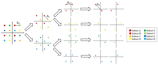 As shown in Figure 3, 16QAM is used as an example to demonstrate the process of dividing 2D constellation subsets. The minimum Euclidean distance of the original constellation points is . After one set division, the minimum Euclidean distance becomes . After second-order set division, the minimum Euclidean distance is . After third-order set division, the minimum Euclidean distance is .