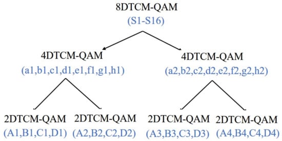 Finally, the optimized 4D subsets are used to compose 8D subsets. In composing the 8D subset, the 4D subsets of different dimensions are Cartesian multiplied, and a total of 64 4D combinations are obtained. Every four 4D subset combines a group, i.e., S1–S16 16 8D subsets are obtained to complete the division and construction of optimized subsets. The 2D subsets, 4D subsets, and 8D subsets of SO-8DTCM-QAM are obtained, as shown in Figure 4.