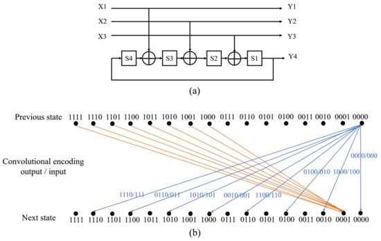In the subsequent coding process, each bit segment needs to be divided into four parts: an 8D subset selection part, a 4D subset selection part, a 2D subset selection part, and a 2D constellation point selection part. In the 8D subset selection part, 3-bit data are needed. The 3-bit data are passed through a convolutional encoder which has a code rate of R = 3/4 and a constraint length of K = 5. One of the sixteen 8D subsets from S1–S16 is selected using the newly generated coded bits b1–b4. The structure of the convolutional encoder and the register state transfer diagram are shown in Figure 5.