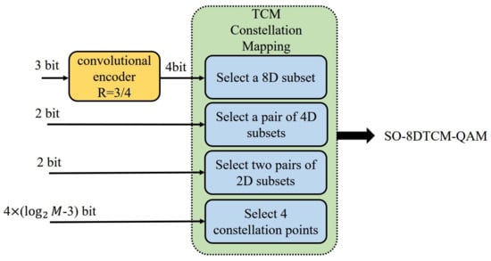The bit utilization diagram is shown in Figure 6. The total spectral efficiency is 7 + 4 × (logM−3) bit/s/Hz, which consists of (3 + 2 + 2) bit for selecting the 8D, 4D, and 2D subsets, as well as [4 × (logM−3)] bit for selecting the constellation points. The scheme realizes the coding of multidimensional signals in correlation with each other, which makes it possible to utilize multiplexing relations for error correction during decoding.