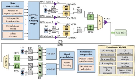 In order to evaluate the performance of the SO-8DTCM-QAM scheme, a simulation system, shown in Figure 7, is established. The SO-8D-TCM-QAM signal to be transmitted is first generated at the transmitter side. The random bit sequence is subjected to a serial-parallel transformation according to the modulation format, and the bit data are partitioned into fixed-length data segments. After the TCM and constellation mapping process mentioned above, four 2D signals are obtained.