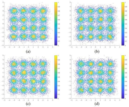 In 2023, Jin et al. performed an experiment to investigate the performance of transmitting 4D/8D-16QAM, as well as 4D/8D-64QAM in standard single-mode fiber using wavelength-division multiplexing (WDM) []. In this paper, in order to evaluate the performance of the eight-dimensional trellis-coded quadrature amplitude modulation scheme, the BER performance of the proposed SO-8DTCM-16QAM scheme is first analyzed and compared with that of the conventional 8D-16QAM scheme under different fiber lengths. In a 20 km optical transmission system, the SNR is set to 20 dB, at which time the 2D constellation diagrams of the SO-8DTCM-16QAM signal in four dimensions are shown in Figure 8.