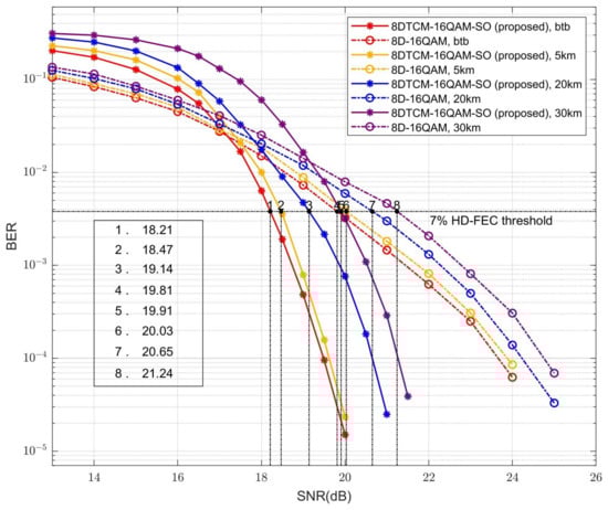 From Figure 9, it can be seen that the shorter the fiber length, the greater the performance gain of the SO-8DTCM-16QAM scheme compared with the conventional 8D-16QAM scheme. When the SNR reaches about 19.50 dB, the performance of the SO-8DTCM-16QAM scheme will be better than that of the conventional 8D-16QAM scheme in all four transmission cases. And in a single transmission case, the SNR gain obtained by the SO-8DTCM-16QAM scheme will increase rapidly when the SNR is further improved. Under the 7% HD-FEC threshold, the SO-8DTCM-16QAM is able to obtain coding gains of 1.60 dB, 1.56 dB, 1.51 dB, and 1.33 dB compared with the 8D-16QAM for the four transmission scenarios, namely BTB, 5 km, 20 km, and 30 km, respectively. This indicates that the proposed subset optimization scheme can meet the transmission requirements well and has more excellent performance at high SNR under different transmission conditions. Meanwhile, the performance of SO-8DTCM-16QAM is slightly lower than that of 8D-16QAM at low SNRs of 13–18 dB, which is due to the fact that the convolutional coding in trellis coding possesses a fixed error-correcting capability, and the output of the decoder will be flooded with errors when the SNR is below a certain threshold. And as the length of the fiber increases, the transmission is affected by the cumulative dispersion in the fiber, which also leads to some degree of performance degradation.
