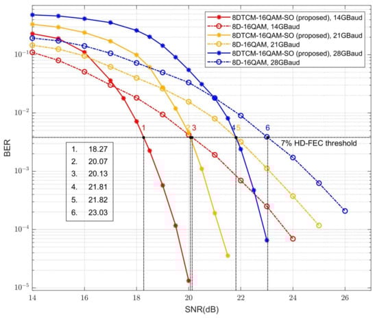 Performance comparison between proposed SO-8DTCM-16QAM and conventional 8D-16QAM at net transfer rates of 14/21/28 GBaud.