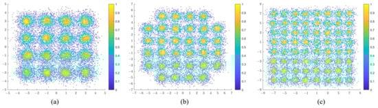 Two-dimensional constellation diagram for SO-8DTCM-QAM in one of the 2D dimensions: (a) Two-dimensional constellation diagram for SO-8DTCM-16QAM in one of the 2D dimensions. (b) Two-dimensional constellation diagram for SO-8DTCM-32QAM in one of the 2D dimensions. (c) Two-dimensional constellation diagram for SO-8DTCM-64QAM in one of the 2D dimensions.