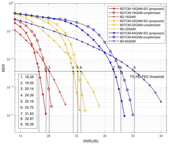 BER performance of conventional 8D-16/32/64QAM, unoptimized 8DTCM-16/32/64QAM, and proposed SO-8DTCM-16/32/64QAM.