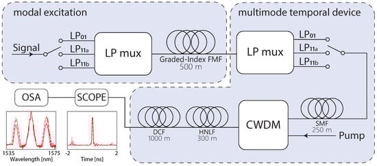 We measure the output of the fiber with our multimode temporal device. We connect the output of the few-mode fiber to a second LP MUX. The second LP MUX separates the different spatial modes into single-mode channels. We connect each single-mode channel to a time lens, which measures the dynamics of the spatial modes with a high temporal resolution. time lenses can perform temporal imaging of ultrafast signals [40]. Our time lenses are based on a four-wave mixing (FWM) process between a signal wave and a chirped pump wave, which occurs in a highly nonlinear fiber (HNLF). We combine the pump and signal waves with a Coarse Wavelength Division Multiplexer (CWDM) before sending them into the HNLF. Since the pump frequency is linearly shifting in time, according to , setting in Equation (1) results in
