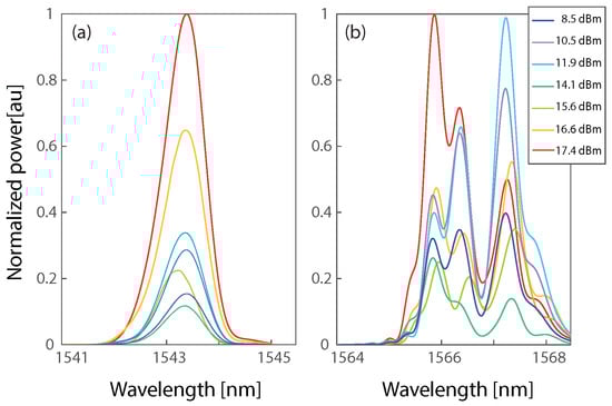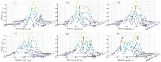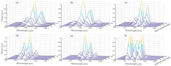 Spectral structures of the output modes when (a) exciting and measuring , (b) exciting and measuring , (c) exciting and measuring , (d) exciting and measuring , (e) exciting and measuring , and (f) exciting and measuring as a function of the input power. The different colors are for improving the visibility of the figure.