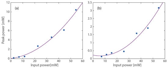 Peak power as a function of the input power for (a) input mode and output mode at 1566.04 nm, and (b) input mode and output mode at 1566.66 nm. The accuracy of the fit is and for (a,b), respectively.