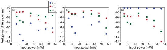Difference in the peak power between exciting a combination of modes and exciting the modes separately, as a function of the input power, for different input combinations: (a) + , (b) + and (c) + . Circles, stars, and squares represent output modes , and , respectively.