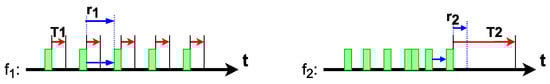 Determining the idle timeout works in such a way that it also covers other possible situations occurring in the network traffic. The method used focuses on two flows from the long category (Figure 2), i.e., long–small and long–large. In order to set the appropriate flow lifetime for the idle timeout parameter, the presented line of reasoning was considered. The flow was set with a constant idle timeout, T1 = T2. In order to illustrate the difference, it was assumed that for the long–small flow, the interval between the arrivals of subsequent packets, r1, is very long, while for the long–large flow, the interval between the arrivals of subsequent packets, r2, is very small. The flows were named f1 for the long–small flow and f2 for the long–large flow, respectively. The time, T1, for a long–small flow is smaller than the interval between the arrivals of subsequent packets, r1. This means that for each subsequent packet that arrives at the switch, it will not find a match because the entry will be removed from the flow table. This will generate a PACKET IN message for each such packet, which in turn means that the controller will have to handle such a packet and reinstall the entry in the flow table. This situation will occur with each subsequent packet that arrives at the switch because the entry will be deleted again before the next packet arrives. Additionally, this will impose a load on the controller, which will have to handle a single packet of such a flow each time, so it will significantly increase the controller utilization load. In the second considered flow, the long–large flow, the value of the idle timeout parameter was set as time T2 equal to the value of T1. In this case, the time T2 is much longer than the time between the arrivals of successive packets, r2, for this flow; the time T2 is a multiple of the time r2. This means that if such a flow is entered into the flow table, each packet that arrives will be matched to this flow and will be handled in accordance with the rules written in the matched rule entry. Each packet match resets the idle timeout counter. The existence of this parameter will only start to make sense when the last packet of this flow arrives. This situation is much better than the previous one because the controller will not be forced to handle the flow with each new packet appearing in the switch. It just needs to be entered into the board when the first packet arrives. However, in this situation, the problem occurs after the last packet arrives because the T2 entry remains in the table even though it is inactive. In this situation, switch memory is used inefficiently because it takes up unnecessary space that could be used for new entries. Examples are shown in Figure 3 for the long–small flows, f1, and long–large flows, f2, respectively.