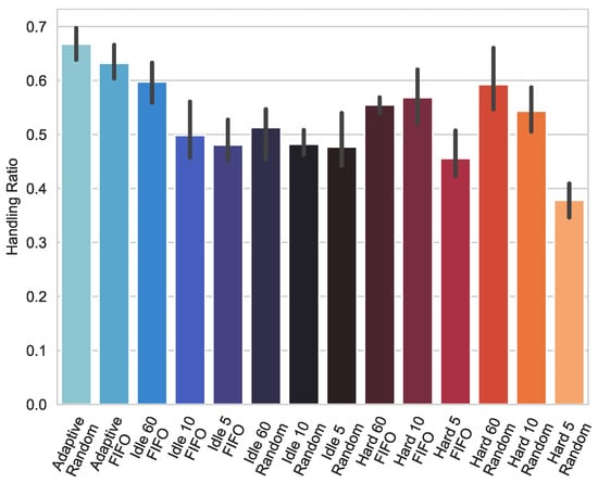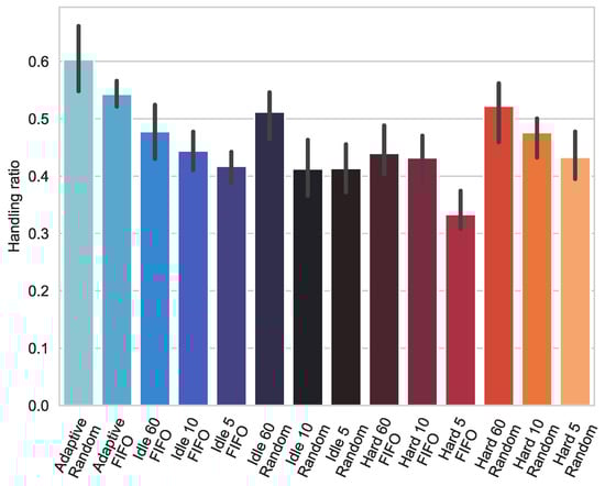 This implies that the proposed algorithm manages the same traffic with fewer requests to write flow rules to the switch memory. Based on the results presented in Figure 5, it can be observed that the proposed algorithm is highly effective at maintaining flows in the table for an extended period, during which new packets continuously appear and there is no need for the controller to re-handle them. This is particularly evident when compared to setting the static flow lifetime for the hard timeout parameter to 5 s. For these methods, the switch service factor is considerably lower than it is for the proposed method. This is due to the fact that the hard timeout parameter is responsible for deleting entries regardless of whether there are new packages that have been matched to it. Consequently, after 5 s, the flow is deleted and must be re-handled by the controller and re-installed in the switch’s memory. Consequently, the presented mechanism for adaptive management of flow lifetimes is demonstrated to utilize more efficiently the available space in the switch memory. Our mechanism performs better for any simple queue with timeout values of even 60 s. Therefore, we were able to achieve a better handling ratio with a much smaller required table capacity, as will be shown in subsequent figures. The results also indicate that algorithms with greater timeout values, i.e., 60 s, tend to provide a greater ratio, although the difference is not very significant.