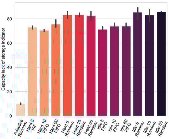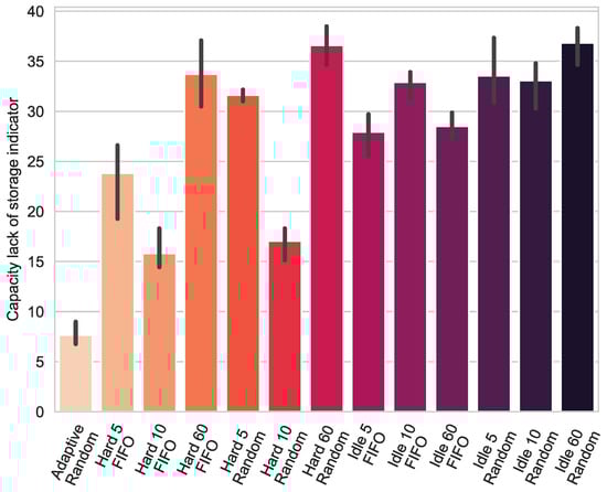 Figure 6 and Figure 7 show the out-of-capacity rate for memory sizes of 1000 and 3000 thousand entries, respectively. The presented simulations show that, for a smaller memory size, there are more unhandled packets due to a lack of space in the flow table. In this situation, a more common phenomenon occurs that forces the controller to handle the packet, resulting in the controller sending a message adding an entry to the switch’s memory, but due to a lack of space, the rule is rejected. This means that the next packet that could be handled in accordance with the rejected rule is, due to its lack of space, sent again to the controller, which once more orders an entry to be added to the flow table. This situation will continue until the controller explicitly requests the entry be deleted or the entry is deleted due to the expiration of its time-to-live. Both Figure 6 and Figure 7 show a significant difference between the proposed adaptive mechanism and methods with set static flow lifetimes. This means that the number of packets that do not find a suitable match in the entry table due to switch memory overflow is much smaller in the adaptation mechanism. This is mainly due to the fact that the mechanism operates on three levels: normal, where entries are stored in the table as long as possible; increased overflow, where more restrictive rules are applied regarding the setting of flow lifetimes; and warning, where when a certain value is exceeded, the packet eviction algorithm is activated. In the proposed solution, the warning level is set to 97% of the maximum TCAM size; this value was selected experimentally. Other mechanisms operate at the level of 70–80 percent of the table capacity, regardless of the used flow timeout and type of queue. There are a few differences that are insignificant in relation to the outcome of our algorithm.