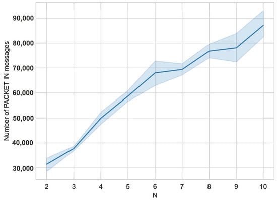 Figure 9 shows an almost linear increase in the number of PACKET IN messages for N from 2 to 10. For larger values of the number N, the number of PACKET IN messages coming to the controller grows more slowly.