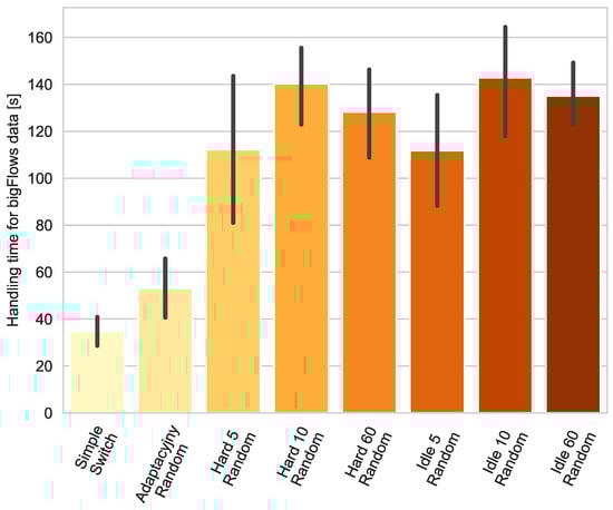 The times presented in Figure 10 were calculated as the average of several simulations, and the 95% confidence interval calculated based on the bootstrap method was also considered. As Figure 10 shows, the fastest traffic was handled using a simple version of the controller, but it should be noted that this controller does not support protocols such as UDP or TCP, and practically all traffic was handled by the switch. Because traffic was only distinguished by its source and destination addresses, it only needed to install two flows in the switch table to handle this traffic. Compared to the basic version of the controller, the adaptive flow time management mechanism handled the sample dataset a little longer, but it should be kept in mind that it supports both TCP and UDP protocols. The figure indicates that our mechanism handles large flows only slightly worse than the simplest possible flow-handling procedure, which is a great outcome. On the other hand, the efficiency is much better than in the case where other mechanisms are implemented.