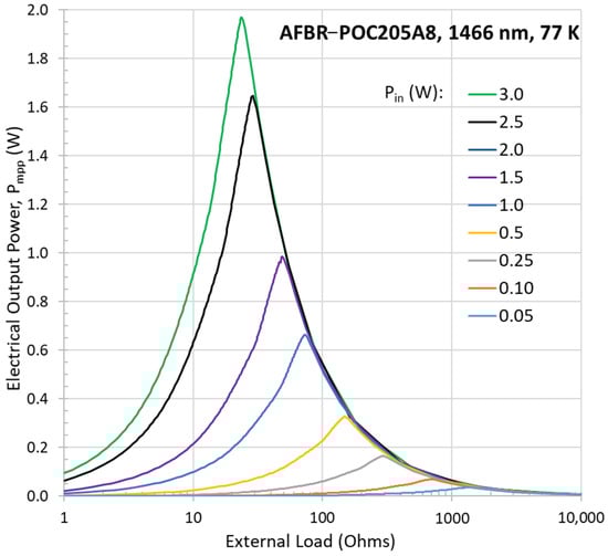 Measured electrical output at 77 K for different optical input powers at 1466 nm transmitted through 10 m of bare polyimide multi-mode fiber, converted using Broadcom’s AFBR-POC205A8 multijunction PT10-InGaAs/InP laser power converter.