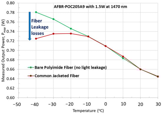 For example, this was observed in experiments using the LPC as a control device, using different fiber types. We measured the light delivered to a given LPC device down to a temperature of −50 °C from a bare polyimide fiber and compared directly with the results obtained with a “common fiber”. An example of such results is shown in Figure 7 for AFBR-POC205A9 LPCs measured at about 1470 nm. Similar to Figure 4 or Figure 5, significant transmission losses could be observed when fiber types other than the bare polyimide fiber were used.