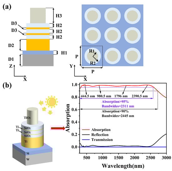 Figure 1a depicts a solar absorber under solar radiation. The structure consists of a periodic array of refractory tungsten and silicon films with a structural period of P = 400 nm, and a silicon film with a thickness of H1 = 50 nm is used to provide excellent light absorption and thermal conductivity. An opaque tungsten metal film with a thickness of D1 = 150 nm was used as a substrate to eliminate light transmission. The uppermost layer is a titanium dioxide disc with a thickness of H3 = 200 nm and a radius of R1 = 80 nm. Titanium dioxide is widely used for solar energy utilization due to its low cost, high temperature resistance, and excellent optical and electrical properties []. On the other hand, SiO2, as a common nanomaterial for absorbers, improves absorption by reducing reflected light in the absorber cavity, and for this purpose, a multilayer absorber disc structure with cascaded optical cavities consisting of Ti and SiO2 between the substrate and TiO2 discs was designed. This multilayer disc structure has a radius of R2 = 150 nm, where the SiO2 and Ti films form an optical cavity, which mainly generates multiple Fabry–Perot resonance modes coupled with SPR resonance modes to capture sunlight, thus enhancing the absorption effect. The thickness of the SiO2 film is H2 = 50 nm, and the thickness of the Ti film is D3 = 10 nm. A thick Ti film deposited on the substrate was used as the last optical cavity, with a thickness of D2 = 150 nm []. We used planar light with wavelengths from 280 nm to 3000 nm illuminated from above the Z-axis to compute a given model structure while making exactly matched layers in the Z-direction with periodic boundary conditions in the X- and Y-directions. We used a mesh precision of 5 and further divided the thinnest Ti disc structure in the cascade optical cavity with a finer mesh precision of 2. The dielectric constants of Ti, TiO2, Si, SiO2, and W were taken from Palik []. The light absorption can be expressed as A = 1 − T − R []. Since the transmittance is cancelled out completely, it is shown that T = 0. Therefore, the absorptivity can be expressed as A = 1 − R.