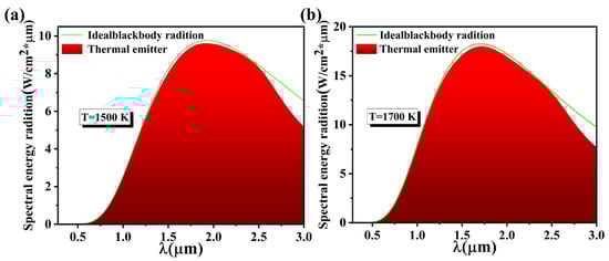 where IBE (w, T) is the ideal blackbody spectral intensity at frequency w and temperature T, and ε(w) is the absorptivity of the surface of the object. As shown in Figure 3a, at a high temperature of 1500 K, we find that only the band around 1500 nm and the infrared band above 2500 nm have a small energy radiation loss, and in all other wavelength ranges, the radiators show a very good fit with the ideal blackbody model, and at this time, the radiation efficiency is 96.38%. As shown in Figure 3b, the losses in the bands around 1500 nm and in the infrared bands above 2500 nm are further compensated at 1700 K, and the thermal radiation efficiency is 96.79%. Since Si has the lowest melting point among the absorber materials we chose, about 1700 K, and any higher temperature would destroy the original absorber structure and material properties, only high temperatures up to 1700 K were investigated, and 1500 K was chosen as a control. It was also concluded that the thermal radiation efficiency of the structure increases with increasing temperature at 1700 K. This is in accordance with the theory in [], as, at this point, the radiator already exhibits extremely high spectral energy radiation, allowing the radiator to be in the range of 280–2500 nm, showing perfect emission intensity, which further shows that this radiator performs perfectly at high temperatures.
