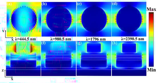 Figure 4a,e show that at 444.5 nm, the electric field is mainly distributed on the surface of the TiO2 disc and at the junction of the Ti and SiO2 discs, which suggests that the strong absorption at 444.5 nm is induced by the coupling of the SPR of the TiO2 discs and the multiple Fabry–Perot resonance modes at the junction of the Ti and SiO2 discs, which helps maintain the high efficiency of absorption in the visible range. Figure 4b,f show that at 980.5 nm, the influence of the TiO2 disc surface plasma on the absorber diminishes, and the electric field is concentrated in the corner surface region of the cascaded optical cavity multilayer absorber disc array consisting of Ti and SiO2, where the absorption peaks in the corner surface region are determined by the SPR. Figure 4c,d,g,h show that the electric field strength in the corner of the TiO2 disc increases with increasing wavelength, and the plasma resonance effect in the disc part of the cascade optical cavity is also transferred to the lowest Ti disc, but there is no coupling of multiple Fabry–Perot resonance modes at the junction of the Ti and SiO2 discs. On the other hand, with the increase in wavelength after 2390.5 nm in the mid-infrared region, the plasma resonance effect is rapidly transferred from the cascade optical cavity to the bottom of the absorber, so the absorption efficiency of the absorber is strongly affected by the SPR effect in the unique cascade optical cavity designed by us. This leads to a decrease in the absorption in the mid-infrared band after a wavelength of 2390.5 nm. In summary, we can conclude that the smooth broadband absorption and efficient emission of our absorber are dominated by the SPR of the discs and the coupling of multiple Fabry–Perot resonance modes in the cascade optical cavity, where the multiple Fabry–Perot resonance modes in the cascade optical cavity are the main influences on the absorption. Included in this, in the mid-infrared region, the absorption efficiency of the absorber in the wavelength range after 2390.5 nm is mainly affected by the transfer of the plasma resonance to the bottom layer, while a deeper reason is the fact that the absorption efficiency is limited by the compatibility between the SiO2-Ti cascade optical cavities of our design as well as the structure of the absorber. In order to reduce the absorption loss, future solar absorbers can be investigated with semiconductor materials with better Fabry–Perot resonance coupling.